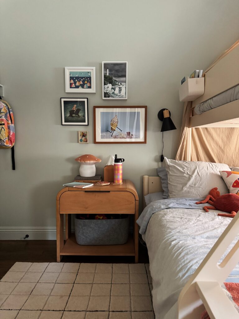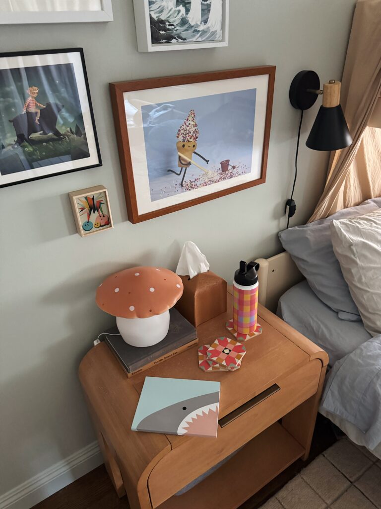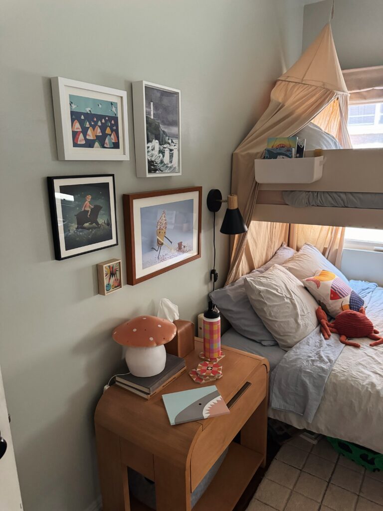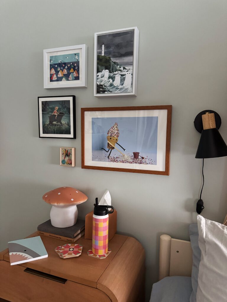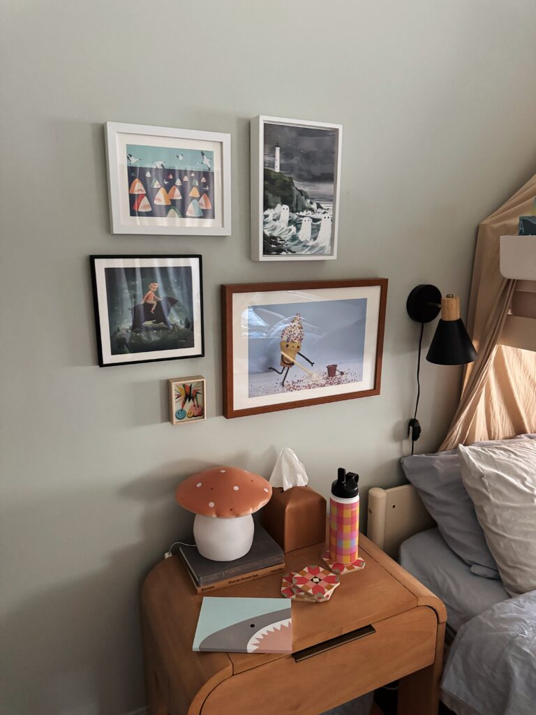 sometimes i feel like gallery walls can feel a little visually overwhelming and cluttered, so i’m really glad i went small scale and low quantity for the art!i feel like it has the visual interest and the personality this wall needed and i don’t think it’s busy enough that we’ll get sick of it anytime soon!!! i’m so happy with it, it just screams arlo. 🙂
