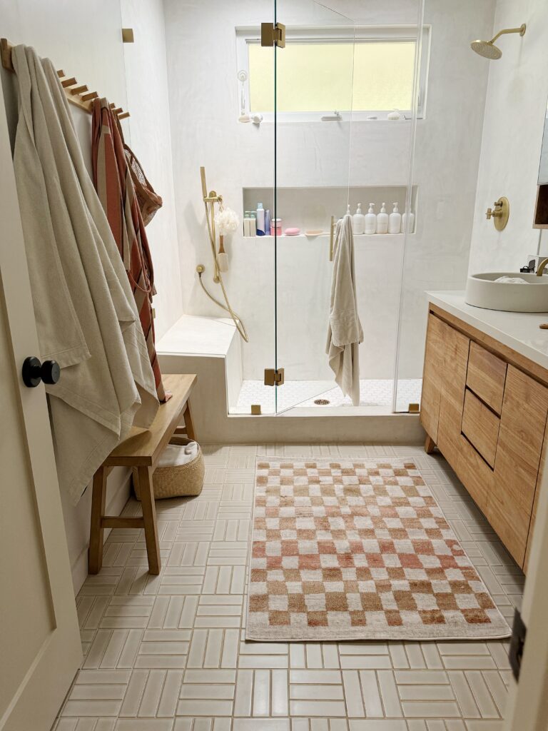 i swapped out our bathroom rug (because i stained our old one with some tanning lotion :/), i got this checkered one that’s technically not a bathmat, but we love a plush rug in the bathroom! (i know some people find that peculiar)