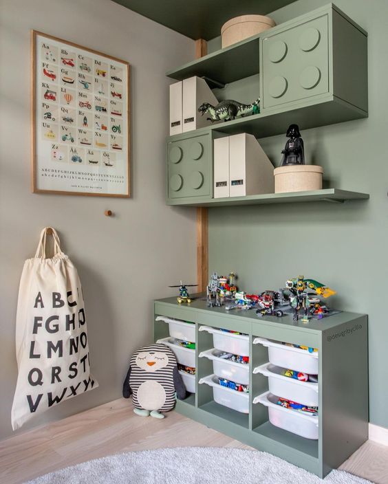 designbycilla a nice example of a painted storage cabinet and very cute lego-themed shelves.