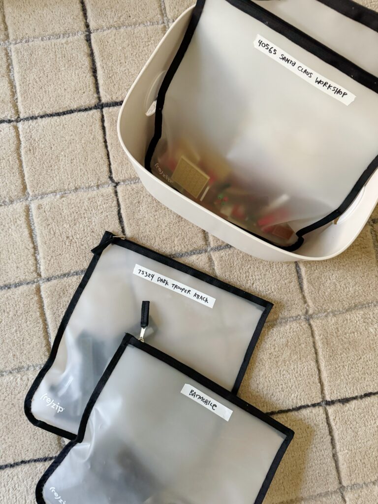 these bags below are really nice and sturdy, and i like that i can fit multiple into a box that i then tuck into the closet, but i don’t love that i can’t see inside that well and they don’t have a separate slot for the instruction manuals. i do love that they’re deep and you don’t risk the pieces going everywhere unless the bag topples over.