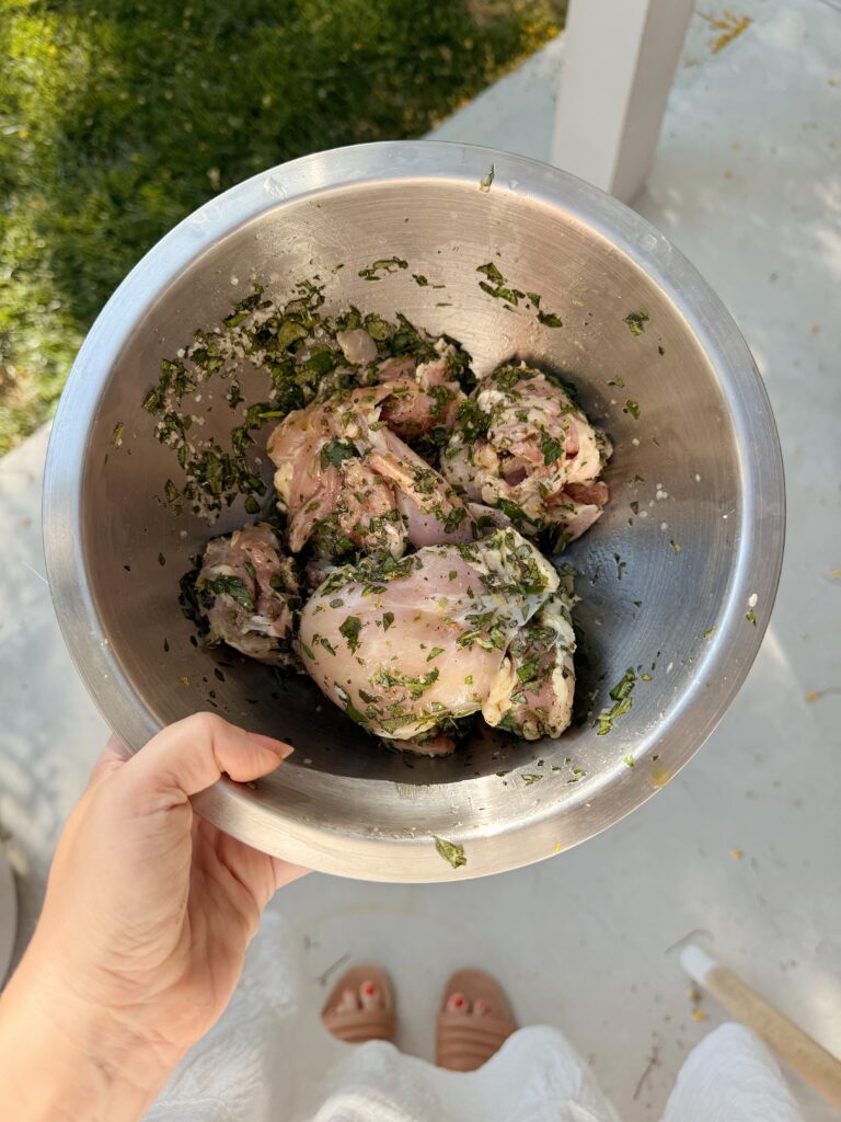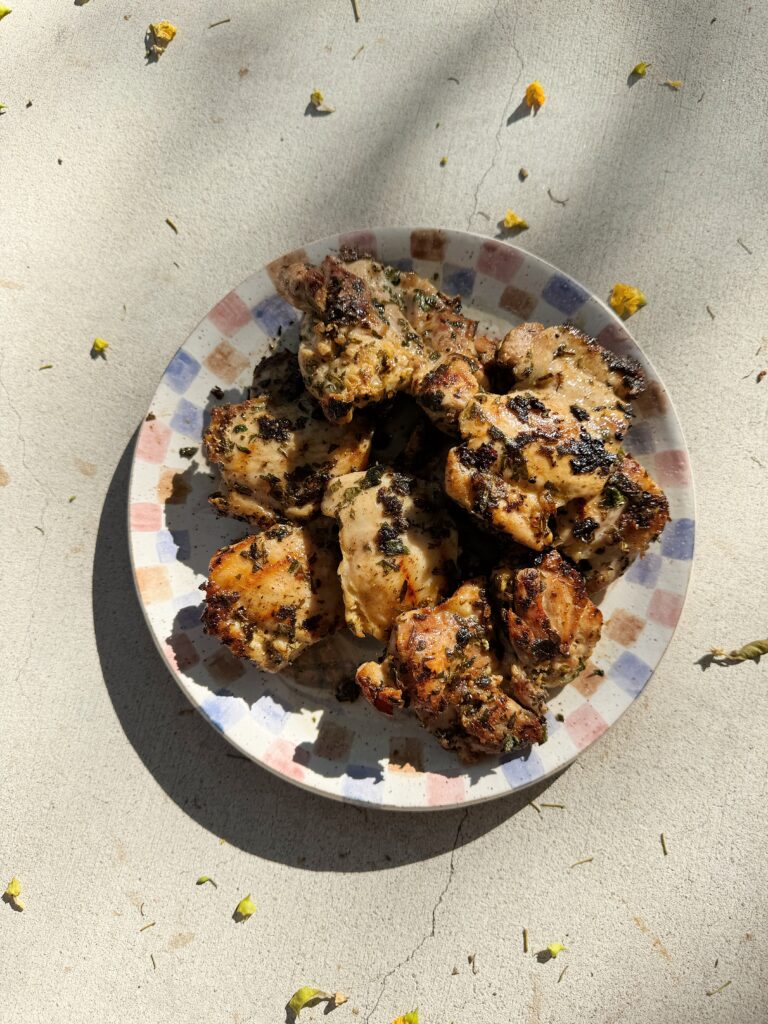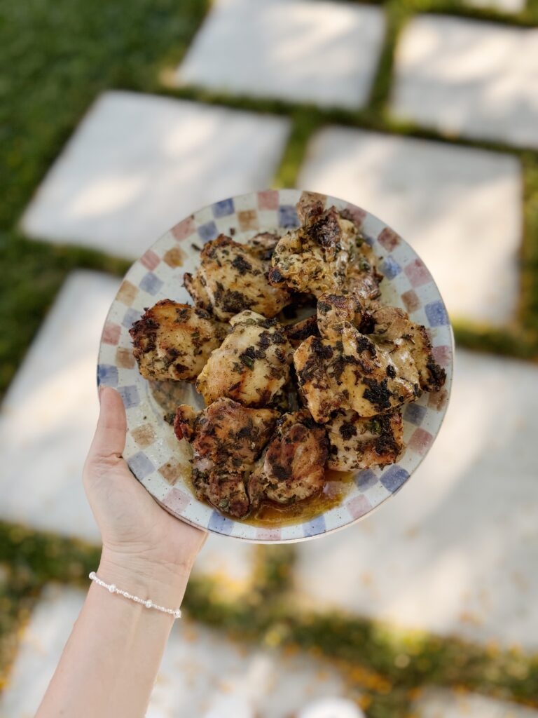 i didn’t include exact measurements because you can just eyeball how much of everything to use depending on the amount of chicken you use! (i’ve made this with only a small package of thighs and the kids basically ate it all and we went hungry, so i make more these days lol)if you want to make a big batch while you go through the trouble of grilling, the leftovers would also make for great lunches over a salad or grain!